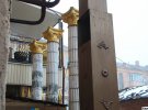 Звертаю увагу, що зі стіни на рівні першого поверху під вікнами магазину великими плямами обвалився тиньк, оголивши стару цеглу. Світло-коричнева фарба на металевій колоні, увінчаній янголом, місцями полущилася, з-під неї починає проступати іржа.