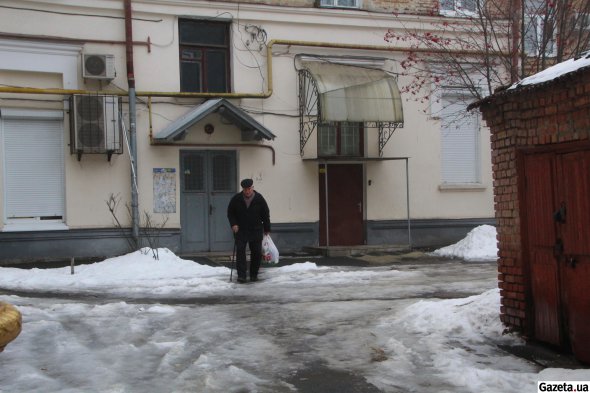 З двостулкових звичайних сірих дверей третього під'їзду виходить літній чоловік у чорній куртці й кашкеті. Тримає білий пакет із логотипом мережі супермаркетів, наповнений пластиковими пляшками. Спираючись на ціпок, обережно йде слизьким снігом нерозчищеного подвір'я.