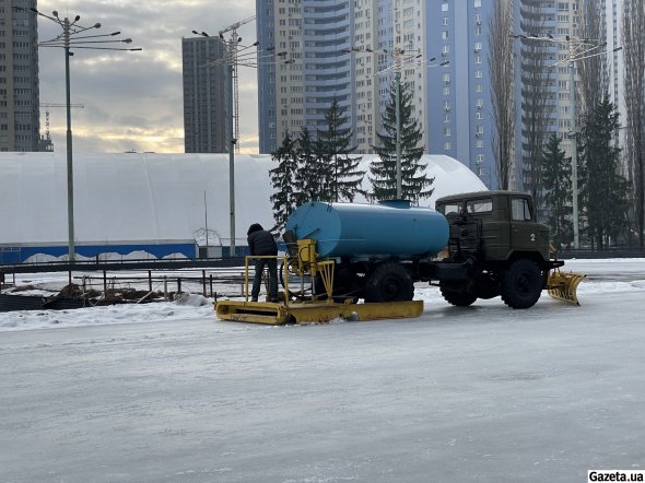 Поряд зі станцією метро Іподром, позаду автобусної зупинки, чоловіки з дрельками в руках вивішують на зелений паркан великий плакат. "Ковзанка відкрита" – сповіщають перехожих.