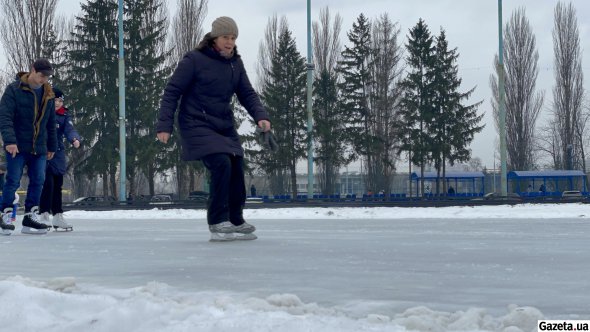 – Як зʼявляється можливість, зимою стараюся підтримувати форму. Торік сюди приходив кілька разів. Був на ВДНХ, на "Рошені", – каже чоловік, називається Дмитром. – А влітку на криту ковзанку, на "Більшовик". Тут лід потрібен, не вистачає температури. Якщо добре підморозить, буде чудово. Ціни демократичні, мені зручно, бо я зі своїми ковзанами. Дають два білети – на прокат ковзанів та на вхід.