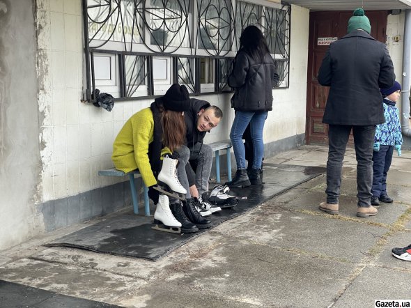 На лавці під дашком, з якого повільно капає талий сніг, надівають ковзани чоловіки й жінки. Під них натягують теплі плетені шкарпетки. Отримати ковзани можна за окремим квитком всередині будівлі в невеликій комірці – тут їх на будь-який розмір.