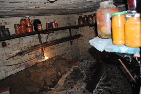 Валентина Казимирівна вмикає світло у затопленому погребі. Спускається униз мокрими сходами. Тут сильно тхне сирістю, від якої на стінах "вискочив" грибок. Замість підлоги – болото. Попри це збереглися стелажі з консервацією.