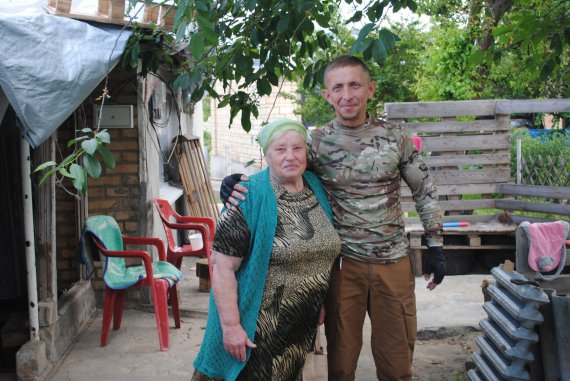 - Женічка наш приїхав, - назустріч виходить жінка у картатому блакитному халаті й з материнською щирістю обіймає волонтера Євгена. Хазяйка обійстя 72-річна Єва Михайлівна Конончук пояснює, що Євген помагає її сім'ї відколи випадково проїжджав повз і побачив їхній зруйнований будинок.