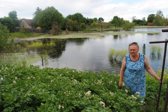 Третина їх городу повністю пішла під воду. Із неї на краю ділянки "визирає" частина хвіртки. Голосно квакають жаби під майже нечутно роботу помпи.