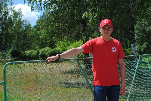 За безпеку людей при евакуації відповідав командир Вишгородського районного загону швидкого реагування товариства Червоного Хреста України 39-річний Андрій Сологуб. Зустрічаємось із ним біля школи села Литвинівка, неподалік Демидова. Андрій працює там директором. Виходить на зустріч у червоній футболці й кепці.