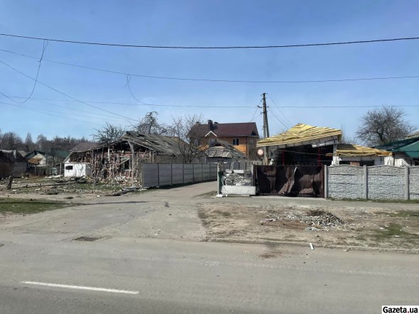 Усі будинки понад трасою розбиті. На асфальтованій дорозі розкидані уламки шиферу, розтрощена цегла, мідні дроти, дрібно потрощене скло, цвяхи. Біля вирв від снарядів валяються брудні куртки, кофтини. Серед іншого - багато дитячих іграшок. Зайці, ведмеді, шматки пластикових ходунків покрилися чорною землею біля домів. На цьому сірому тлі в очі впадають охайні жовті нарциси, які густо розцвіли попід хатами.