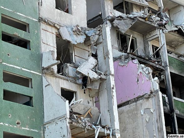 На чернігівській вулиці Вʼячеслава Чорновола стоїть панельна 10-поверхівка. Фасад будинку відпав від прильоту бомби в 500 кг. У квартирах немає вікон, балкони відлетіли із панелями та утеплювачами. Від них на стінах залишилися сліди клею. Бетонні плити подекуди чорні від кіптяви. Деякі квартири всередині вигоріли вщент. "Тіло" багатоповерхівки пронизане дірками - сюди влучали снаряди.