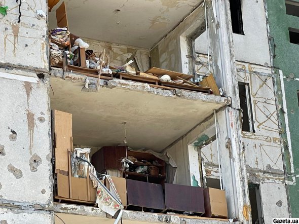 - А шо он, - показує на будинок жінка. - Без вікон, без дверей. Пльонками позабивали. Ви бачили б, що творилося! Тут було по метру скла скрізь, ми ж усе прибираєм. Місяць не розмовляла після того - так злякалася, шо це вообще! Бігла не знаю куда. Тут подзвонили: "У ваш будинок бомба попала". І я остановилася. Приїхали знайомі, отхаювали мене. Я була в квартирі.