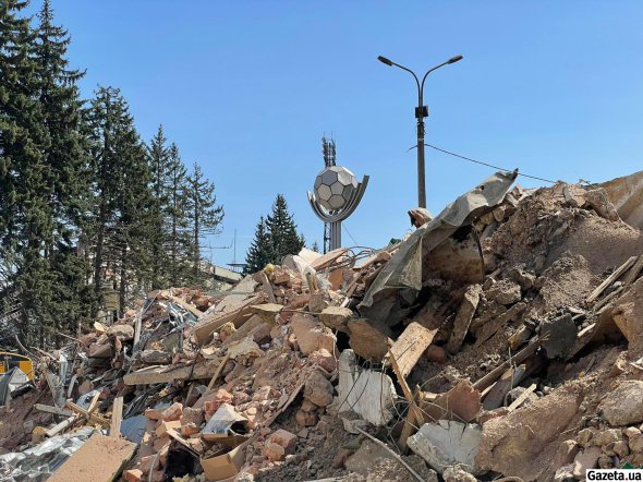 Майже усюди навколо стадіону - купи каміння, бетону, цегли. Все лежить уперемішку з пластиковими осколками від глядацьких крісел зеленого, блакитного та червоного кольорів. Будівля, де сиділи сторожі, розсипалася на друзки. Ракета пробила навіть фундамент. Великі шматки стін підіймає екскаватор.