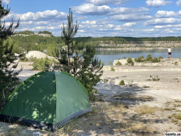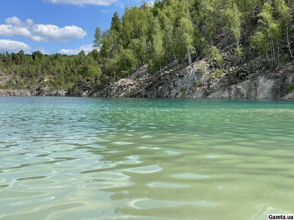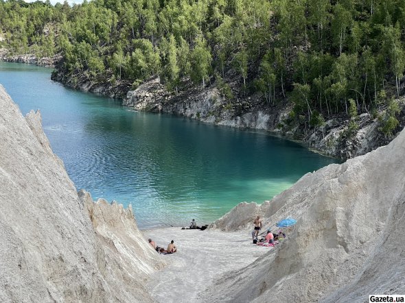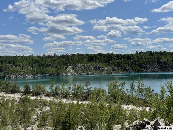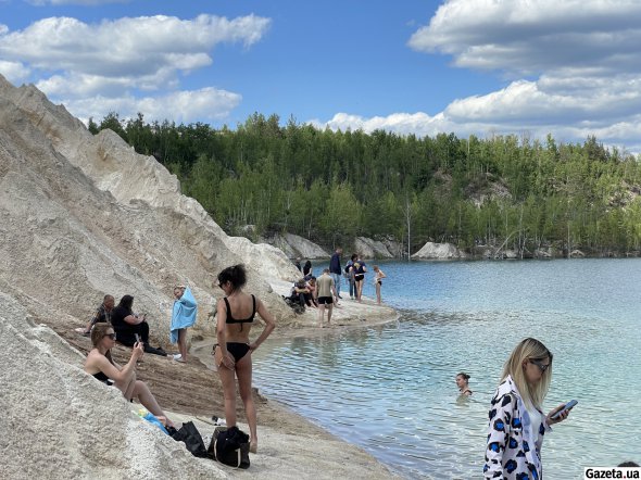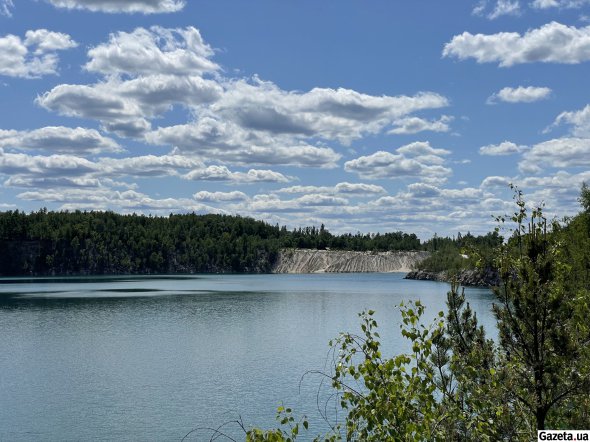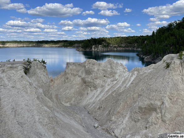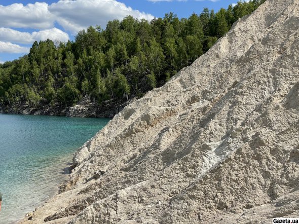 За смугою беріз і осик відкривається вид, у який не одразу можна повірити. За білими насипами, що подібні на гори чи то дюни, розлилося озеро. Воно переливається бірюзою, блакиттю й синявою – залежно від того, звідки дивитися.