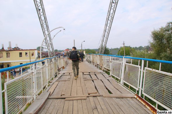 Пішохідний міст через річку нині не в найкращому стані: металеві конструкції пошкоджені уламками снарядів, розкурочений метал швидко іржавіє – корозія розпливається рудими плямами по старій білій фарбі. Опори переправи місцеві використовують як дошку оголошень. Тут збереглися об'яви, написані від руки та примотані скотчем.