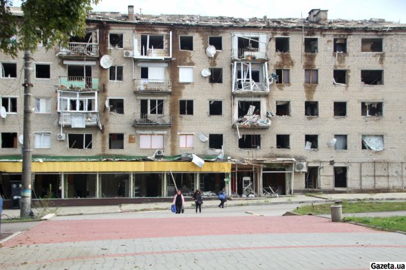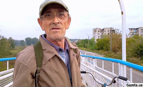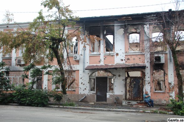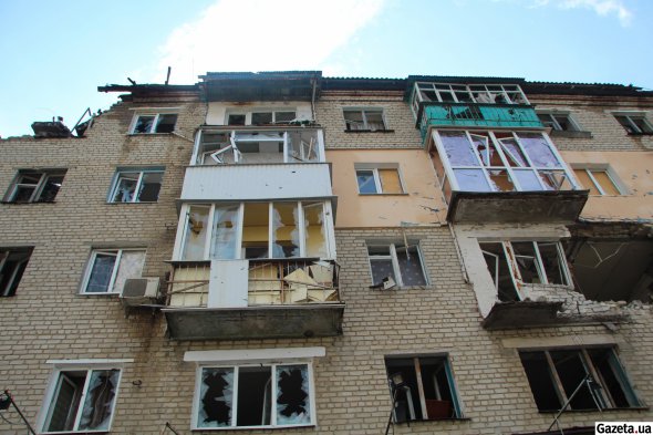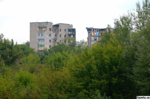 – Када начався обстрєл, наші стояли на Крем'янці, а вони (росіяни. – Gazeta.ua) – на тому березі. Нас бомбили сильно – авіація і танки. Бачте, шо з домами подєлали, – показує на розбомблену 9-поверхівку ліворуч від себе. В будинку повністю знищений під'їзд – дві половини дому розділяє прірва. Яскравими плямами через осінню імлу майорять фарбовані стіни колись затишних квартир. – Ми поняли, шо вже всьо, вони заходять.