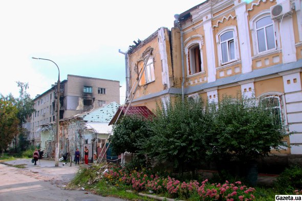 Практично кожна будівля в цьому кварталі пошкоджена обстрілами. Більшість будинків не мають дахів, вікна вибиті, стіни – в подряпинах від шрапнелі. Частина старого фарбованого у жовтий колір двоповерхового будинку на перетині вулиць – готова от-от обвалитися. Щоб відстрочити цей момент, стіну підперли довгими палями.