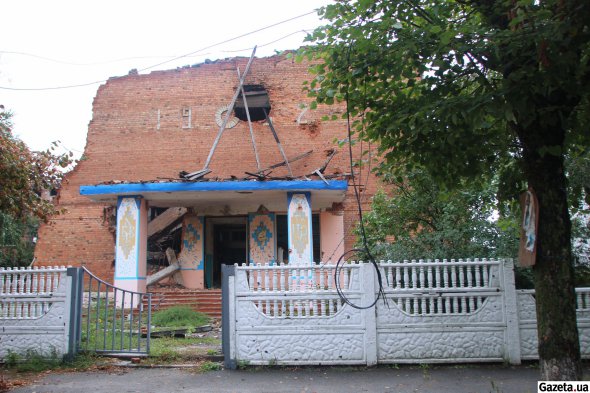 За школою стоїть церква – храму теж дісталося. Уламками та вибуховою хвилею в будівлях на подвір'ї повибивало вікна, посікло двері. В позолоченому куполі зяє дірка – туди влучив російський снаряд.