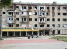 Показує на цегляну 5-поверхівку поряд, в якій зруйнована верхня кутова квартира, вибиті вікна, а в стіні посеред дому – зяє велика діра від артснаряда. Магазини на першому поверсі зруйновані дощенту.