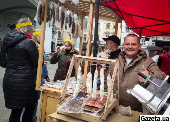 39-річний Андрій Башанський із Жовкви, містечка на Львівщині, за освітою кухар. На фестиваль привіз свою продукцію марки "Баша Кухня" – крафтові сиров'ялені делікатеси за авторською рецептурою. Ковбаски, бастурму, в'ялену яловичину у вині, салямі, вироби з конини - загалом 17 видів м'ясних смаколиків. Ціна за 100 г продукції – від 50 грн. Сімейну справу започаткував шість років тому.
