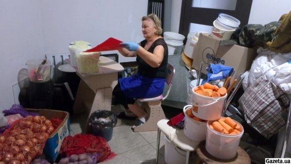 Говоримо в невеличкому закапелку зали, який використовують для господарських потреб. Тут на білій плитці підлоги лежать великі сітчасті мішки з овочами – капустою, морквою, картоплею. На стільці у двох пластикових білих відрах жовтогарячою горою лежить начищена морква.