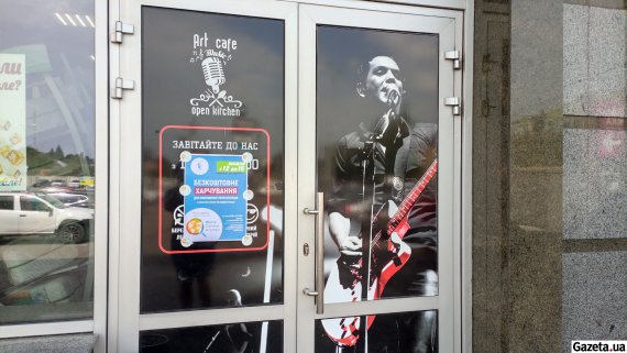 На великій парковці перед арткафе Open Kitchen не видно жодного натовпу. До дверей із зображенням чоловіка з гітарою (гітариста британського гурту Placebo Браяна Молко. – Gazeta.ua), люди підходять по одному чи по двоє. Спочатку заглядають всередину й тільки потім заходять.
