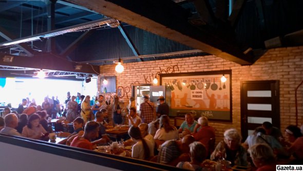 Смачно пахне пловом і капустяним салатом. Чути роботу телевізора – єдині новини транслюють через проєктор на білій стіні над входом. Люди в черзі практично ні про що не говорять між собою, здебільшого гортають смартфони.