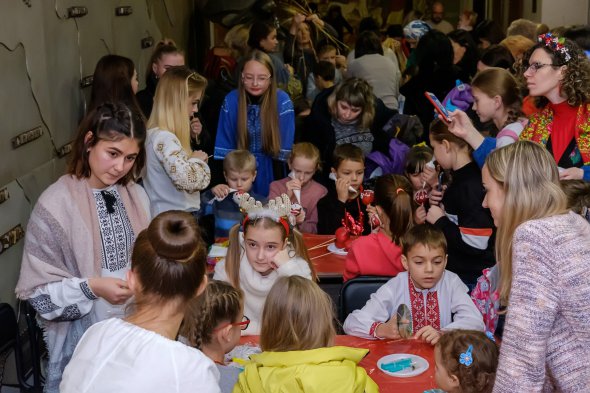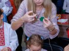 На другому поверсі для дітей проводять майстер-класи. За різними столами роблять ляльки з кукурудзяного листя, розписують печиво, виготовляють ялинкові прикраси. З усіх боків чути дитячі вигуки: "Мам, мам, подивись".