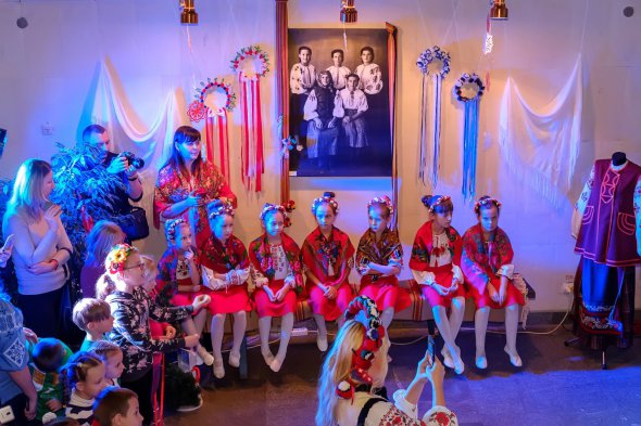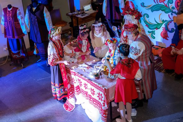 У приміщенні музею на першому поверсі людно і тісно. Посеред зали на імпровізованій сцені ведуча Леся Побиванець у сукні-вишиванці розповідає про традиції ворожіння на Андрія.