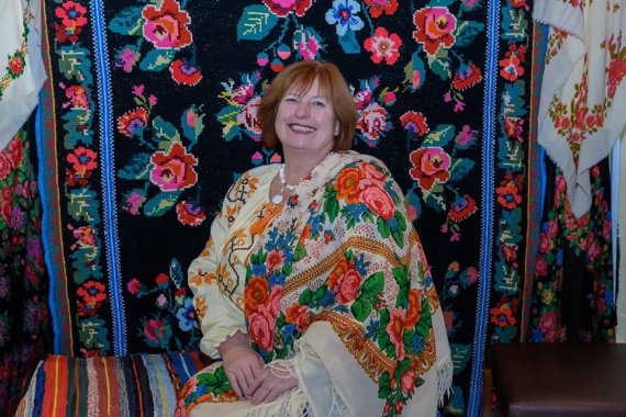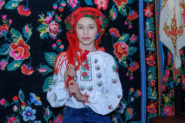 Праворуч, на тлі вишитого килиму на стіні, стоїть лавка. Жінка у білій хустці припрошує присісти. Показує, як українки носили традиційний головний убір. Швидкими рухами пов'язує дівчинці хустку, потім дає велике дзеркало, щоб на себе глянулаи. Та усміхається й просить подругу сфотографувати.