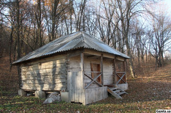 - Узимку 2010 року цю хату сюди встановили. Спочатку перетягли трактором. Потім краном підсадили, поставили на полозки. Перетягли льодом. Тут уже краном переставили. Це не хата, а комора без вікон. Такі в селах використовували для зберігання харчів. Ми відчиняємо її, якщо треба щось знімати. Або перевдягнутися після купелі, - розповідає жінка.