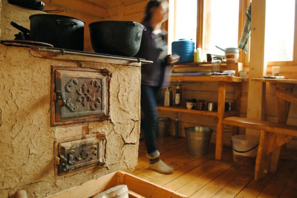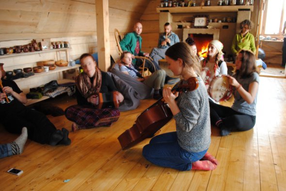 На порозі великого дерев'яного будинку прибита табличка "Роззуватися". Сам поріг захаращений взуттям гостей. Вони приїхали взяти участь у триденних майстер-класах з традиційної музики, які організував столичний освітній проект "Рись". У "хатчині" співають, живуть та відпочивають.