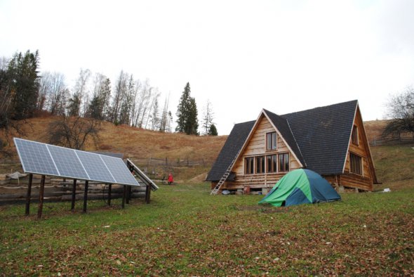 Біля обіду навколо "хатчини" блукає з півтора десятка овець. У загороді - троє поросят, поруч - білий кудлатий пес на прив'язі. Посеред двору стоять панелі сонячних батарей, бо електрика сюди не дійшла. Десь далеко біліють розкидані по горах чужі обійстя.