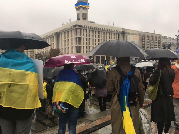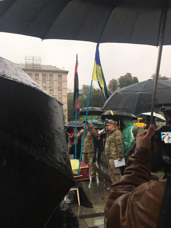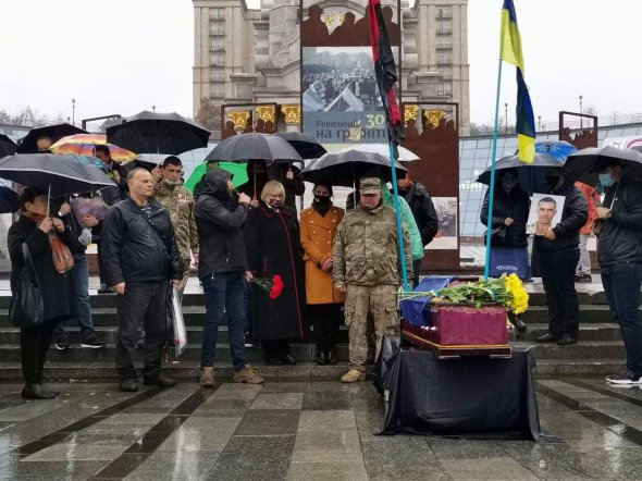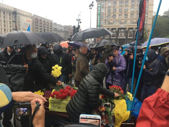 - Ти куди? Ходімо через пішохідний перехід. Зараз знаєш, які штрафи за те, щоб перебігти в недозволеному місці? Тим паче ми ще встигаємо, - говорять жінки між собою, тримаючи в руках квіти. Вони поспішають на Майдан Незалежності. На тому ж місці у ніч з 10 на 11 жовтня ветеран АТО 49-річний Микола Микитенко підпалив себе в знак протесту проти чинної політики влади. У військового обгоріли 90% шкіри. 14 жовтня від отриманих опіків чоловік помер у лікарні. А сьогодні з ним прощалися біля Монументу Незалежності.