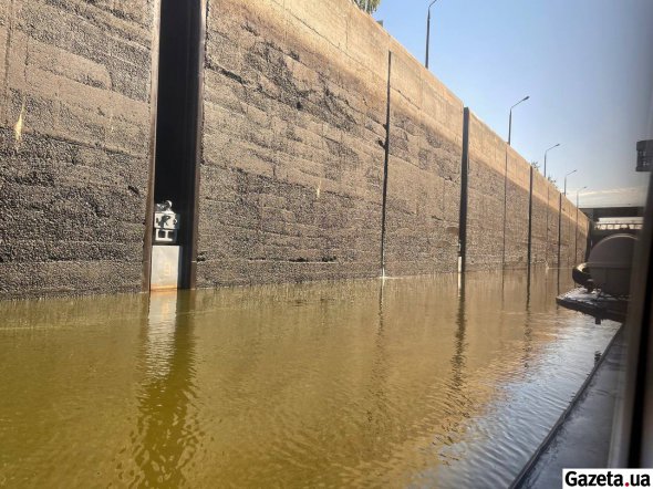 Перед Каневом теплохід запливає на шлюзування. Рівень води у Дніпрі змінюється залежно від місця. Нас мають опустити на 11 метрів. "Нібулон" заходить між високих залізобетонних стін. Їх верх з каюти неможливо побачити.