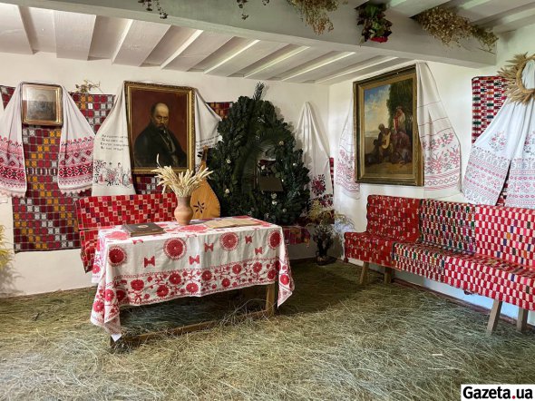 У холодному холі висять роботи майстрів на шевченківську тему. Посеред другого залу на підвищенні лежить килим. На ньому понад 200 років тому стояла домовина Кобзаря.