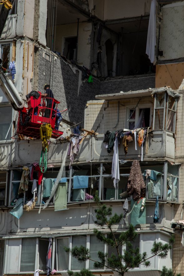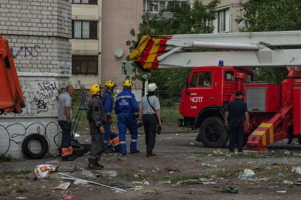 - Газ вибухнув. Нас не було тоді вдома. Що зараз у квартирі, не знаємо. Он видно, що перекосилося все, - говорить жінка в шортах.