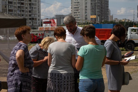 Повз будинок йде начальник управління з питань цивільного захисту Роман Ткачук. Навколо нього збираються мешканці.