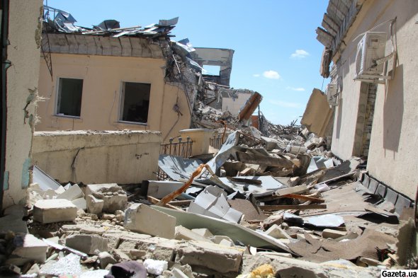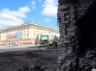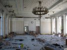 Вибиті всі двері й вікна, праворуч видно провалля від верхнього поверху донизу, на колонах - чорні плями від пожежі. Від зруйнованого даху залишилися декілька металевих листів, якими грається вітер. На половину людського зросту закладені білими поліпропіленовими мішками з піском парадний вхід і великі вікна холу. Всередині двоє чоловіків в армійських шоломах і бронежилетах із наліпками "експерт" і "будівельник" щось обговорюють, роблять помітки в паперах, закріплених на планшетах.