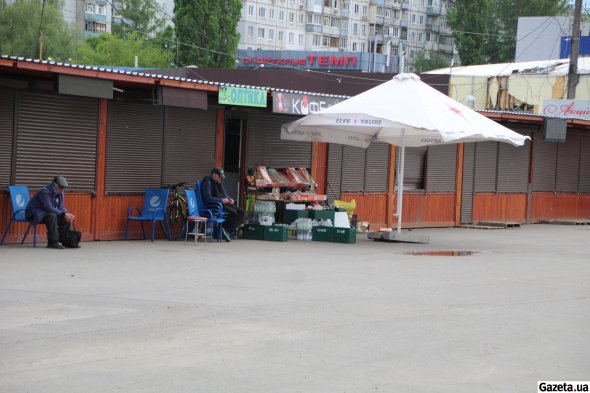 Навпроти в торговельному ряду закриті всі ятки, окрім однієї, де торгують бакалією. Хазяїн - чорнявий чоловік років 40 у темній куртці та джинсах - сидить на синьому металевому стільці біля відкритих дверей.