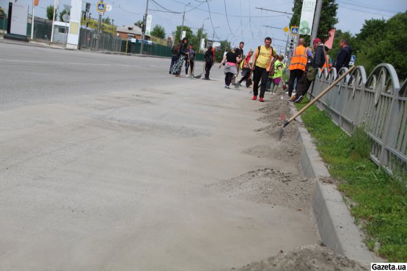 Обабіч від доріжки встановлені два однакових стола, на них кухонне приладдя, упаковки кави та чаю. Одразу в кількох місцях складені на купи дрова для багаття - акуратно подрібнені гілки й стовбури фруктових дерев. Над входом до під'їзда на розтяжках повісили банер із рекламою якогось банку - як захист від дощу та сонця.