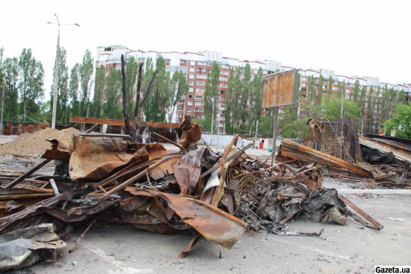 Між майданчиком і дорогою іржавими горами височіють залишки автівок і павільйонів. Цій частині ринку не пощастило опинитися майже в епіцентрі потужного вибуху авіабомби.