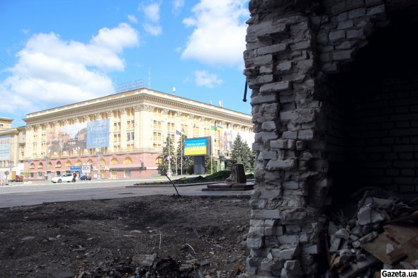 У будівлях, розташованих у цій частині площі, замість вікон - фанерні щити. Загалом споруди майже непошкоджені. Окрім однієї. На перший побіжний погляд обласна адміністрація здалеку має звичайний вигляд - зберігся фасад, колони. Територія навколо ретельно прибрана. Та за детальнішого погляду стає зрозуміло - будівля пошкоджена вибухом. 1 березня о 8:00 її обстріляли росіяни.