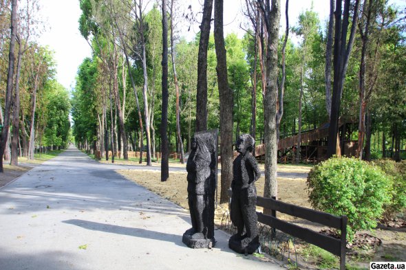 Ліворуч на головній алеї помічаю купу піску та засипаний ним майданчик, на якому стирчать обгорілі стовбури дерев із залишками металевого ланцюга. Поряд виставлені дві обвуглені статуї, що колись зображували індіанців.