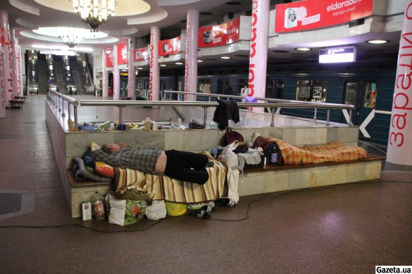 Біля виходу зі станції метро Університет молода жінка говорить телефоном, сидячи на бордюрі. Вдягнена в лосіни, спортивну куртку, на ногах поверх теплих шкарпеток - гумові капці. Виглядає так, ніби щойно вийшла з квартири. Вона - одна зі 120 людей, що нині проживають на цій станції.