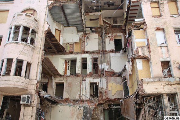 У кварталах навколо ОДА будівлі теж постраждали. Десь вибухова хвиля вибила вікна, а від офісного центру зі скляним фасадом неподалік залишилися лише металеві конструкції та перекриття. Трохи далі вулицею замість чотирьох поверхів житлового будинку вижно глибоке провалля - бомба пробила дах, перекриття поверхів і фундамент.