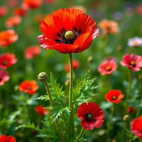 Мак польовий. Яскраві червоні квіти, які легко розмножуються самосівом. Росте навіть у бідному ґрунті, щільно покриває ділянку.