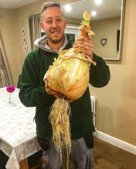 Британцю Марку Шепарду вдалося виростити велетенську ріпчасту цибулю вагою не менше 5 кілограмів кожна. Найбільший екземпляр чоловік планує представити на місцевому конкурсі гігантських овочів. Вага цієї цибулини становить майже 7 кг.