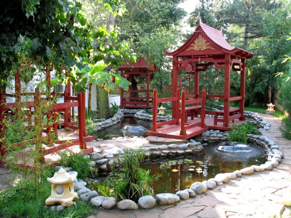 4. Альтанки-пагоди. Відмітна риса таких споруд — загнуті краї даху. Альтанка в японському саду має бути збудована з натуральних матеріалів — деревини або каменю.