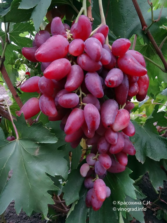 3. Із темних сортів має ще виноград Ася з півметровими гронами. Ягоди краплеподібні вагою 20 г. М'якоть солодка, з легкою кислинкою, має кісточки. Дозріває за 130 днів у другій половині серпня.