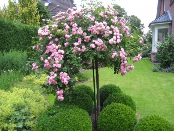 Штамбові троянди є трендом останніх років серед квітникарів. Їх називають готовим букетом на палиці. Цвітучі дерева виглядають, як пишні фонтани.