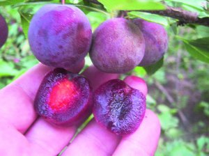 — Мабуть, найкраще дерево в моєму садку, — говорить Щербань. — Починає плодоносити наступного року після посадки. Плоди завбільшки як середня слива. Ароматні, м'ясисті, темно-бордового кольору. Смак мають неповторний. Солодкі, ніжні, схожі одночасно на сливу й вишню. Підходять і на компоти, і на варення.