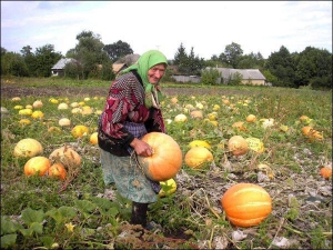 85-річна Антоніна Проскуренко з Деражнянського району на Хмельниччині щороку вирощує гарбузи зі свого насіння. Сіє його у прогріту землю між рядками картоплі.
