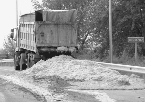 — Тут и дебилу видно, что это поломался борт. Железо лопнуло, борт открылся сам, — говорить біля вантажівки Сергій Молодик, керівник фірми-перевізника "СТС Транс". Він у сорочці і джинсах, згрібає купу лопатою. — Мне самому интересно, почему так. Третий раз в одном месте.
